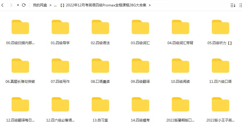 收藏 2022届12月大学英语四级 CET4 Promax全程课程28G资料包 网课文件目录:00.四级扫描内部讲义(含增值音频)01.四级导学02.四级语法03.四级词汇04.四级词汇带背05.四级听力06.真题长难句突破07.四级写作08.口语晨读09.四级翻译10.四级阅读11.四六级口语12.四级翻译每日一句12.四六级必备语音现象13.自习室14.四级模考15.四六级考试延期政策解读+备考规划2022版暑期版口语能力提升2022版小王子英文原著精读 考研课程全程大学英语四级 本站所有内容均可免费下载 一、特别说明:注册会员后每天有3次免费下载各类模板、素材、课程次数,请慎用! 二、如急需下载多个素材,请赞助VIP获取更多下载次数!点击了解详细说明 三、赞助方式:注册会员—>赞助获取更多下载次数 上一篇:2022年12月大学英语四级全程班 43G课程资料大合集 下一篇:2022届12月英语六级CET6 Promax全程班课程共30G
