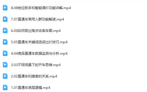收藏 ├──阿呆直通车实战体系课 |├──1.01直通车底层逻辑.mp432.30M|├──2.02直通车和搜索的关系.mp416.77M|├──3.03不同场景下的开车思维.mp429.01M|├──4.04竞品直通车数据监测与分析.mp420.22M|├──5.05直通车关键词选词出价技巧.mp434.62M|├──6.06如何测出高点击率车图.mp440.56M|├──7.07直通车常用人群功能解读.mp436.20M|└──8.08抢位助手和智能调价功能讲解.mp437.79M 网络营销直通车阿里巴巴 本站所有内容均可免费下载 一、特别说明:注册会员后每天有3次免费下载各类模板、素材、课程次数,请慎用! 二、如急需下载多个素材,请赞助VIP获取更多下载次数!点击了解详细说明 三、赞助方式:注册会员—>赞助获取更多下载次数 上一篇:如何利用淘宝短视频进行店铺起步,并替代传统的搜索方式,课程由蓝sir主讲 下一篇:优伯乐提供的PS精品课系列课程,学习Photoshop的高级技巧和应用
