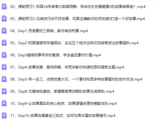 30天情感写手培训营(完结)网课文件目录:02、课前预习1-知音24年读者大数据洞察,告诉你女性最爱看0的故事有哪些?.mp403、课前预习2-没有技巧讲不好故事,知音主编教你如何快速0打造一个好故事.mp404、Day1-灵感素材三部曲,教你有效积累.mp405、Day2-知音情感写手情报站,去这五个地方这样交流容易挖出故事猛料.mp406、Day3情感故事写手的智慧,学会鉴定素材价值.mp407、Day4-故事创意,案例拆解,手把手教你快速构思和提炼主题.mp408、Day5-举一反三,点燃创意火花,一个素材构思多种故事题材的创作方法.mp409、Day8-文章结构基础,掌握最简单流畅的故事主线架构..mp410、Day9-让故事真实的核心秘技,故事逻辑合理性推敲法则.mp411、Day10-故事发展黄金三段式,如何勾画丰富的故事情节.mp412、Day11-行文前准备,学会用素材推动情节发展带好文章节奏.mp413、Day14-万事开头难,教你六种故事开头方法助你文思如泉涌.mp414、Day15-故事结尾法大全,让文章故事值得回味写作方法.mp415、Day16-掌握细节处理方法,制造“画面感”让你的故事看得见.mp416、Day17-故事反转技巧,写出让人拍案叫绝的精彩情节.mp417、Day18-知音独家标题生产法,写出吸睛爆款好标题.mp418、Day19-知音杂志内训改稿方法,让文章成为精彩好故事.mp419、Day20-学会抓热点、造金句,屡试不爽的过稿方法.mp420、Day23-在专业写手眼中,这些用稿平台是如何高低分类的.mp421、Day24-拆解各大用稿平台样稿,搞懂平台用稿特点,投其所好.mp422、Day25-如何与用稿平台编辑聪明相处,成为编辑部的御用红人.mp423、Day26-如何巧用新媒体平台分发作品获利,几何级扩大文字收入.mp424、彩蛋课-六种开头在三段式结构中的应用以及如何设置伏笔.mp4