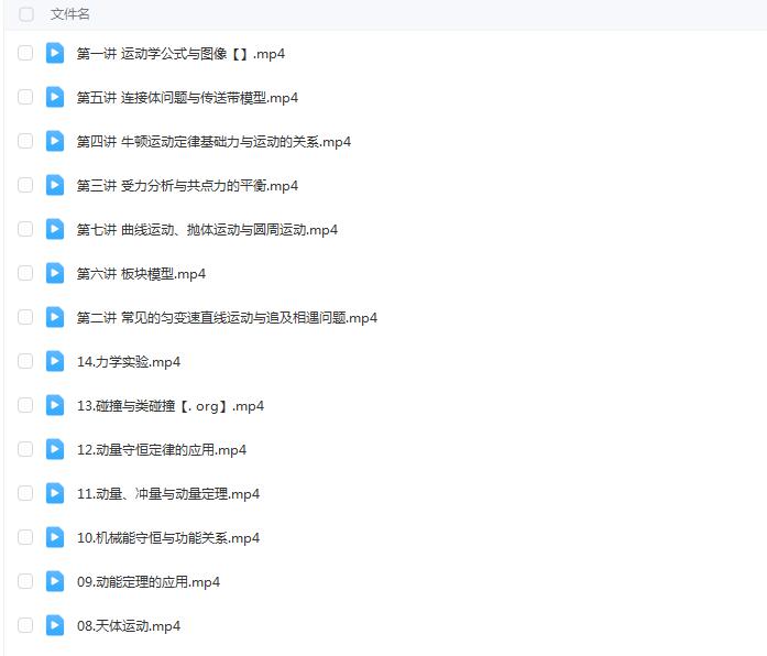 收藏 2024高三高考物理 崔春雨 一轮 暑假 完结网课文件目录:第一讲运动学公式与图像.mp4第二讲常见的匀变速直线运动与追及相遇问题.mp4第三讲受力分析与共点力的平衡.mp4第四讲牛顿运动定律基础力与运动的关系.mp4第五讲连接体问题与传送带模型.mp4第六讲板块模型.mp4第七讲曲线运动、抛体运动与圆周运动.mp408.天体运动.mp409.动能定理的应用.mp410.机械能守恒与功能关系.mp411.动量、冲量与动量定理.mp412.动量守恒定律的应用.mp413.碰撞与类碰撞.mp4 高中物理物理暑假 本站所有内容均可免费下载 一、特别说明:注册会员后每天有3次免费下载各类模板、素材、课程次数,请慎用! 二、如急需下载多个素材,请赞助VIP获取更多下载次数!点击了解详细说明 三、赞助方式:注册会员—>赞助获取更多下载次数 上一篇:贾帅数学2024高三高考数学一轮暑假 下一篇:孔维刚化学2024高三高考化学一轮暑假
